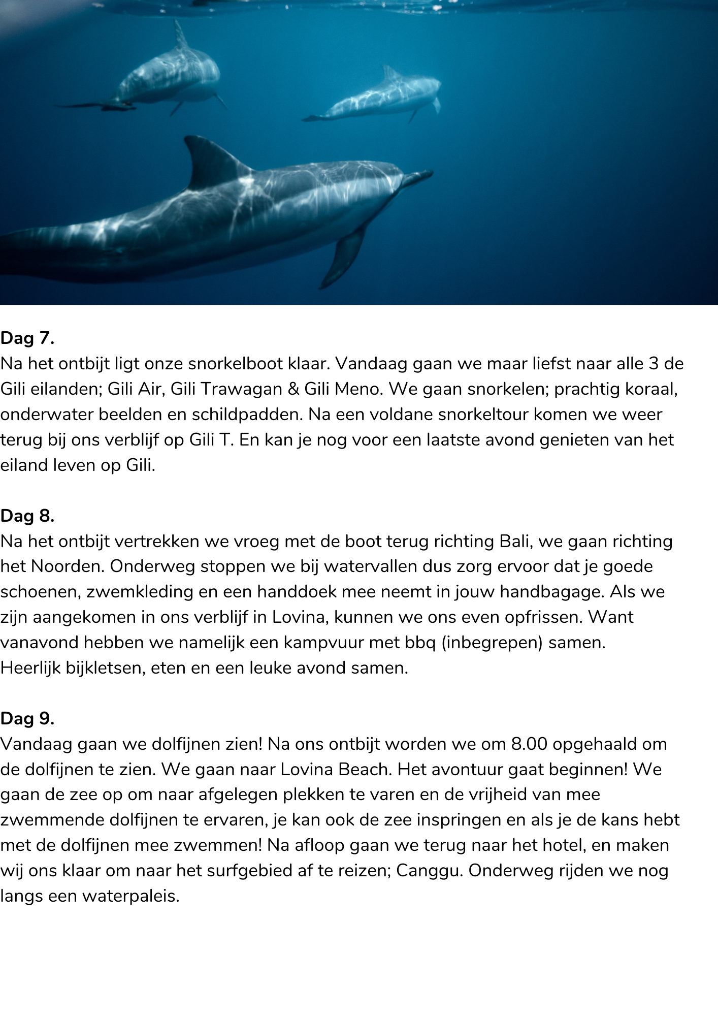 Vandaag gaan we dolfijnen zien! Na ons ontbijt worden we om 8.00 opgehaald om de dolfijnen te zien. We gaan naar Lovina Beach. Het avontuur gaat beginnen! We gaan de zee op om naar afgelegen plekken te varen en de vrijheid van mee zwemmende dolfijnen te ervaren, je kan ook de zee inspringen en als je de kans hebt met de dolfijnen mee zwemmen! Na afloop gaan we terug naar het hotel, en maken wij ons klaar om naar het surfgebied af te reizen; Canggu. Onderweg rijden we nog langs een waterpaleis.