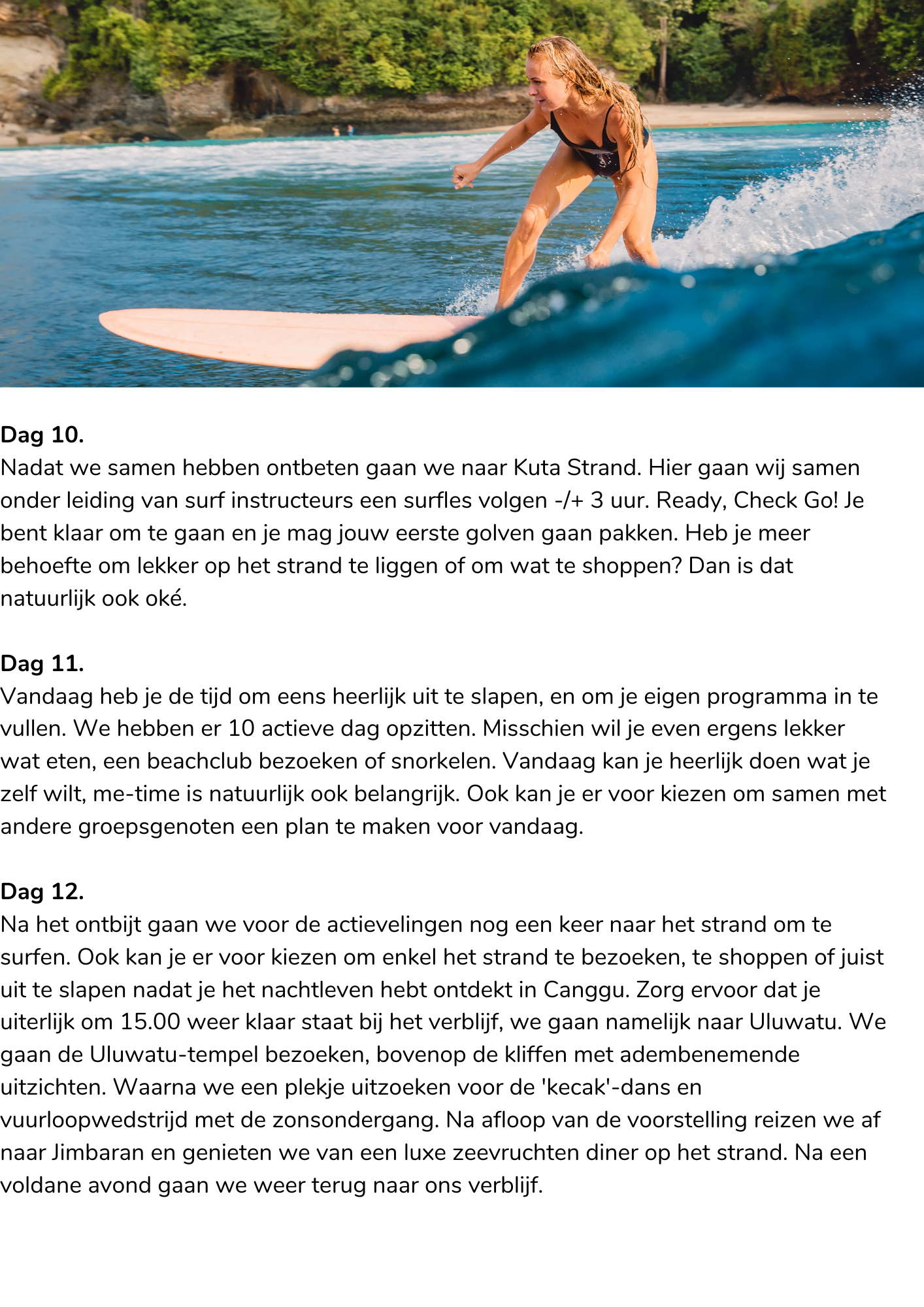 Nadat we samen hebben ontbeten gaan we naar Kuta Strand. Hier gaan wij samen onder leiding van surf instructeurs een surfles volgen -/+ 3 uur. Ready, Check Go! Je bent klaar om te gaan en je mag jouw eerste golven gaan pakken. Heb je meer behoefte om lekker op het strand te liggen of om wat te shoppen? Dan is dat natuurlijk ook oké.