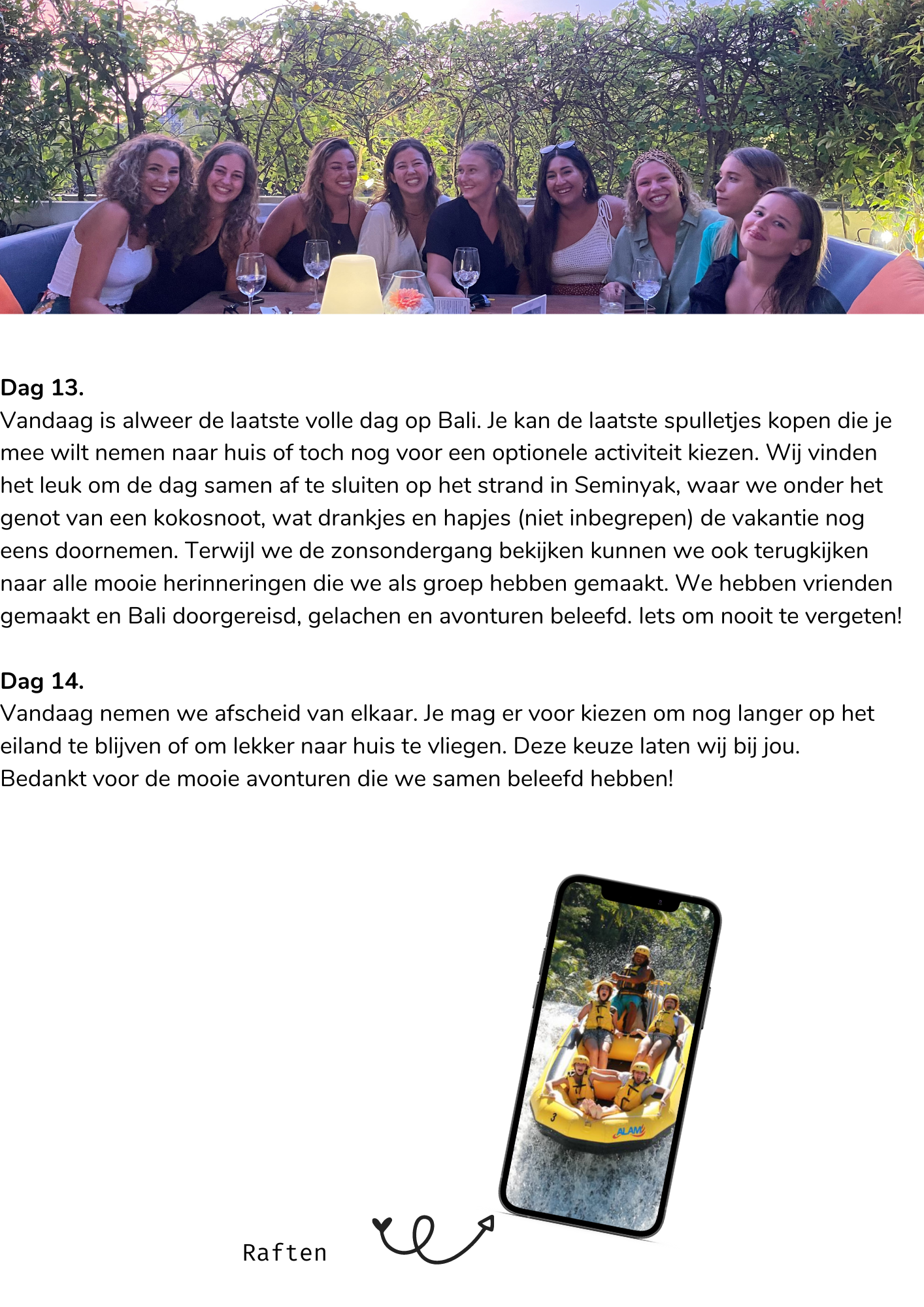 Vandaag is alweer de laatste volle dag op Bali. Je kan de laatste spulletjes kopen die je mee wilt nemen naar huis of toch nog voor een optionele activiteit kiezen. Wij vinden het leuk om de dag samen af te sluiten op het strand in Seminyak, waar we onder het genot van een kokosnoot, wat drankjes en hapjes (niet inbegrepen) de vakantie nog eens doornemen. Terwijl we de zonsondergang bekijken kunnen we ook terugkijken naar alle mooie herinneringen die we als groep hebben gemaakt. We hebben vrienden gemaakt en Bali doorgereisd, gelachen en avonturen beleefd. Iets om nooit te vergeten!