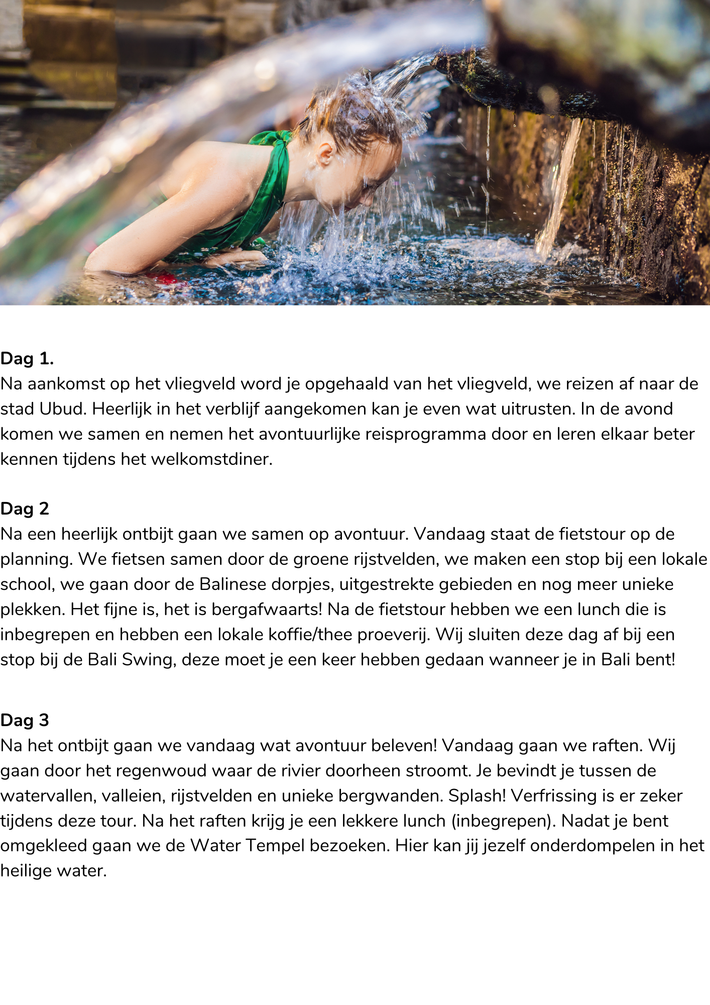 Na het ontbijt gaan we vandaag wat avontuur beleven! Vandaag gaan we raften. Wij gaan door het regenwoud waar de rivier doorheen stroomt. Je bevindt je tussen de watervallen, valleien, rijstvelden en unieke bergwanden. Splash! Verfrissing is er zeker tijdens deze tour. Na het raften krijg je een lekkere lunch (inbegrepen). Nadat je bent omgekleed gaan we de Water Tempel bezoeken. Hier kan jij jezelf onderdompelen in het heilige water.