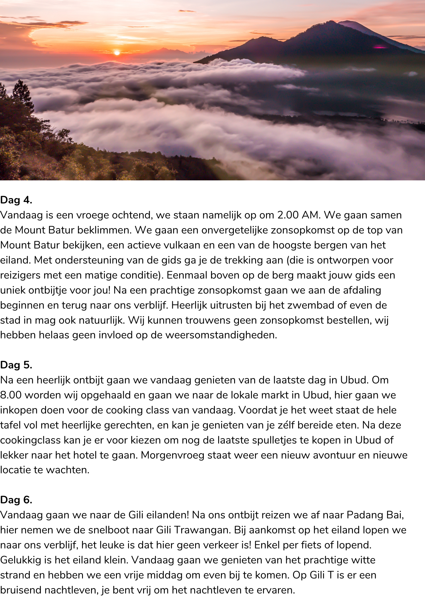 Vandaag is een vroege ochtend, we staan namelijk op om 2.00 AM. We gaan samen de Mount Batur beklimmen. We gaan een onvergetelijke zonsopkomst op de top van Mount Batur bekijken, een actieve vulkaan en een van de hoogste bergen van het eiland. Met ondersteuning van de gids ga je de trekking aan (die is ontworpen voor reizigers met een matige conditie). Eenmaal boven op de berg maakt jouw gids een uniek ontbijtje voor jou! Na een prachtige zonsopkomst gaan we aan de afdaling beginnen en terug naar ons verblijf. Heerlijk uitrusten bij het zwembad of even de stad in mag ook natuurlijk. Wij kunnen trouwens geen zonsopkomst bestellen, wij hebben helaas geen invloed op de weersomstandigheden.